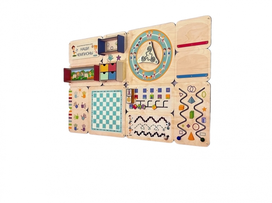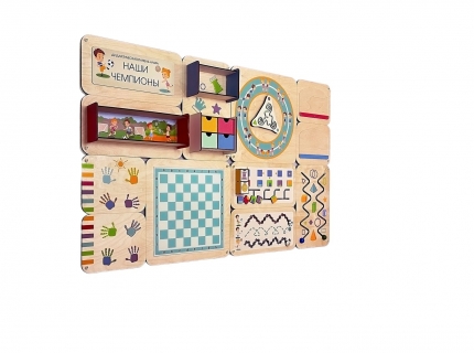 Комплект поставки | Название игровой панели «Наши чемпионы»; Полки для выставочных материалов – 2 шт; Акриловая рамка для А4 – 2 шт; Спортивная игра «Дотянись ладошками до солнышка»; Магнитная игра «Шахматы и шашки»; Игра «Собери свою разминку»; Тренажёр для глаз; Спортивный нейротренажёр; Лабиринт «Собери фигуру»; Методическое пособие с примерами занятий; Карточки для занятий |