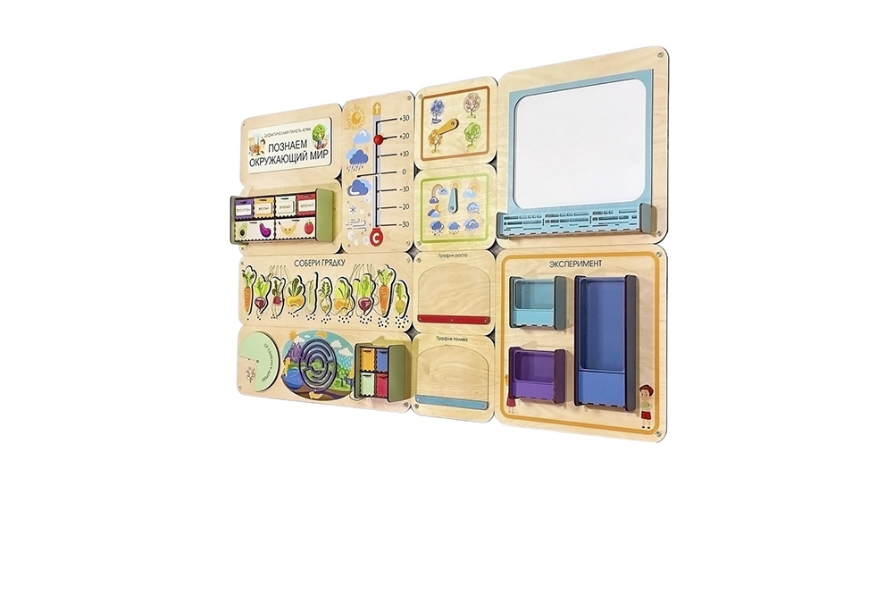 Комплект поставки | Название игровой панели «Познаем окружающий мир»; Эксперимент по выращиванию растений и изучению корневой системы; Акриловая рамка для графика роста растений; Акриловая рамка для графика полива растений; Познавательная игра «Погода за окном»; Познавательная игра «Времена года»; Мини-метеостанция для изучения температуры за окном; Игровой блок «От семени к дереву»; Познавательная игра «Круговорот воды»; Набор карточек для дидактических занятий группы; Игра-сортер для изучения фруктов и овощей; Собери грядки Методическое пособие с конспектами занятий |