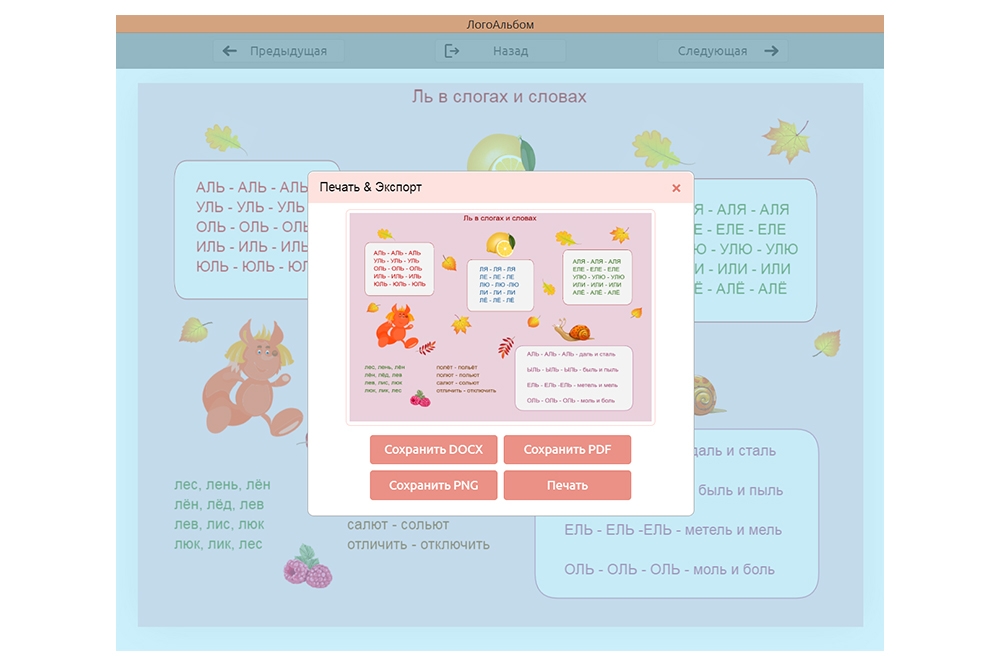 Программа состоит из дидактического материала и профилей детей, где сохраняются результаты занятий: