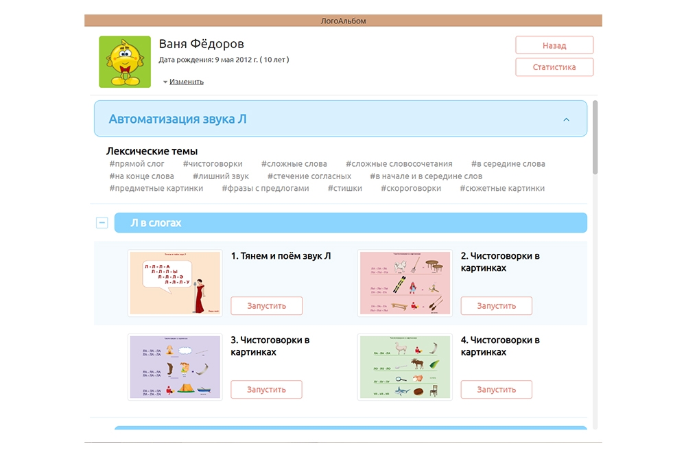 2) Профили детей - в профиль ребенка можно записать его имя, фамилию, возраст, выбрать аватарку. В нем автоматически сохраняются данные по занятиям: когда занимались, сколько и над какими звуками работали.