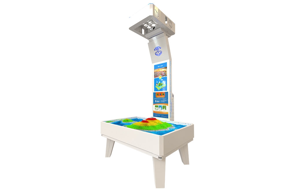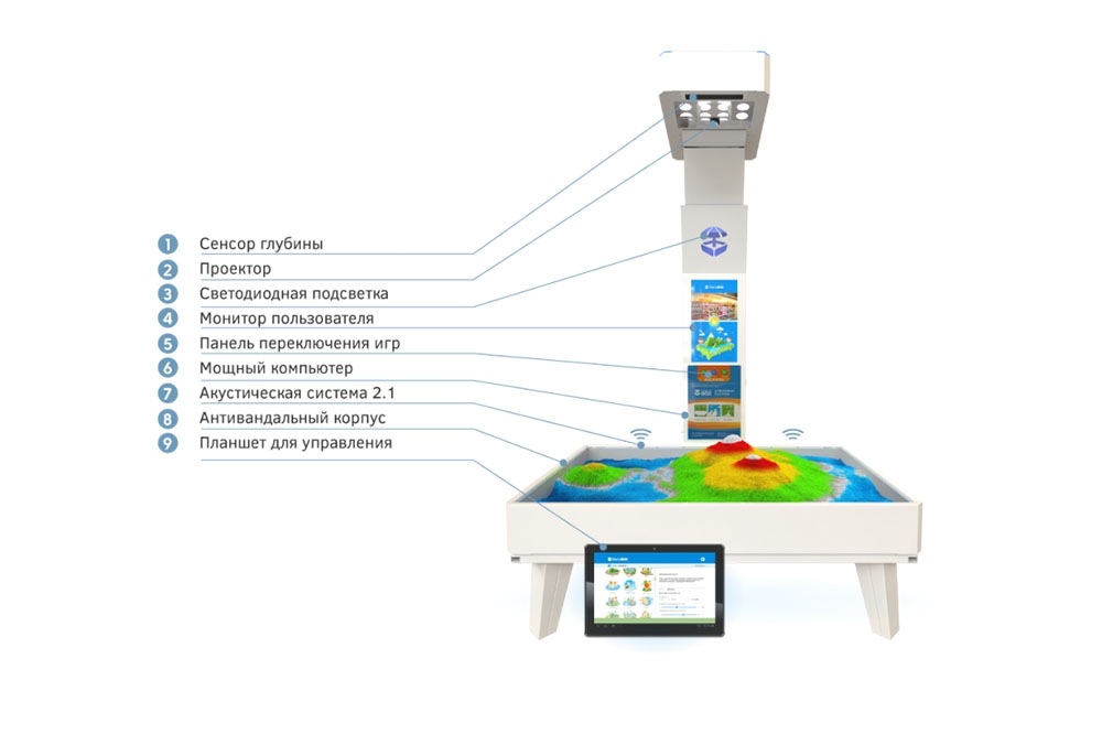 Работа интерактивной песочницы построена на технологии дополненной реальности. На песок проецируются настоящие текстуры водных объектов, гор, вулканов и многих других поверхностей. В итоге, песочница, дает возможность Вам своими руками создать собственный мир, который можно изменить мгновенно.