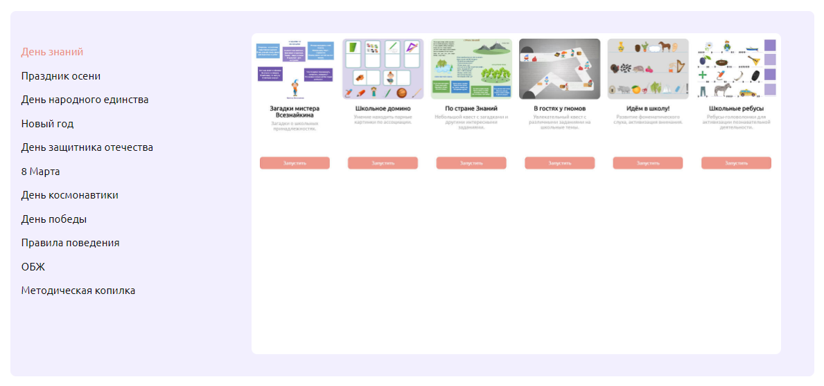- Чтение (На скамейке, Моё имя, Космические рейнджеры, Слоговые домики, Слогобумс, Слоговое домино, Русские горки, Верная подпись, Какэточитать, Сокровища фараонов, Все наоборот, Клубничный рейс, Маша ест кашу, Вова дома, В гостяках у Джинна, Ребус мумии, Отважный Фридрих).