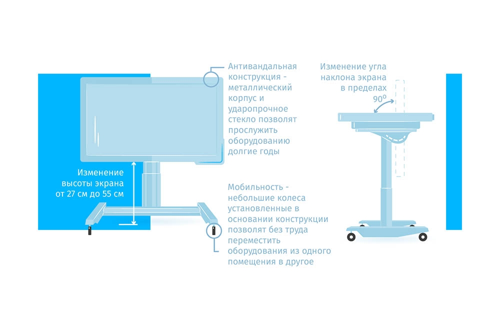 Входит в комплект | Сенсорный экран с диагональю 55 дюймов (139,7 см) и фунцией "мультитач" до 20 касаний, Мобильная стойка с электроприводом подъема и наклона экрана, Акустика 2 × 10 Вт, Компьютер на базе AMD Ryzen 3, ОС: Windows 10 IoT, Wi-Fi модуль, ПО (опционально): 80 развивающих игр и 110 тестов для детей 3-8 лет, Техническая документация (инструкция по сборке, паспорт, гарантийный талон). |