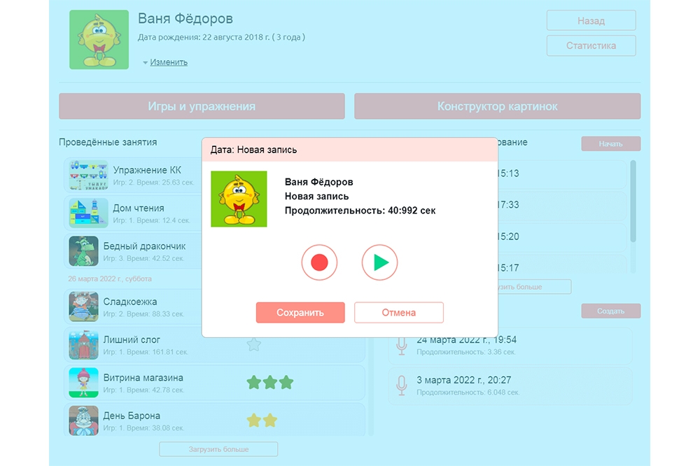 Звуковой альбом поможет следить за динамикой развития речи ребенка. В программе удобно записывать речь ребенка. Записи можно дать прослушать ребенку, чтобы он со стороны услышал свою речь и понял ошибки.