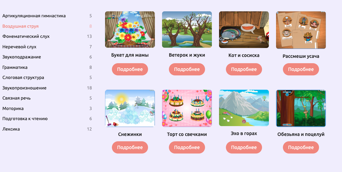 - Дыхание, воздушная струя (Букет для мамы, Ветерок и жуки, Кот и сосиска, Рассмеши усача, Снежинки, Торт со свечками, Эхо в горах, Обезьяна и поцелуй).
