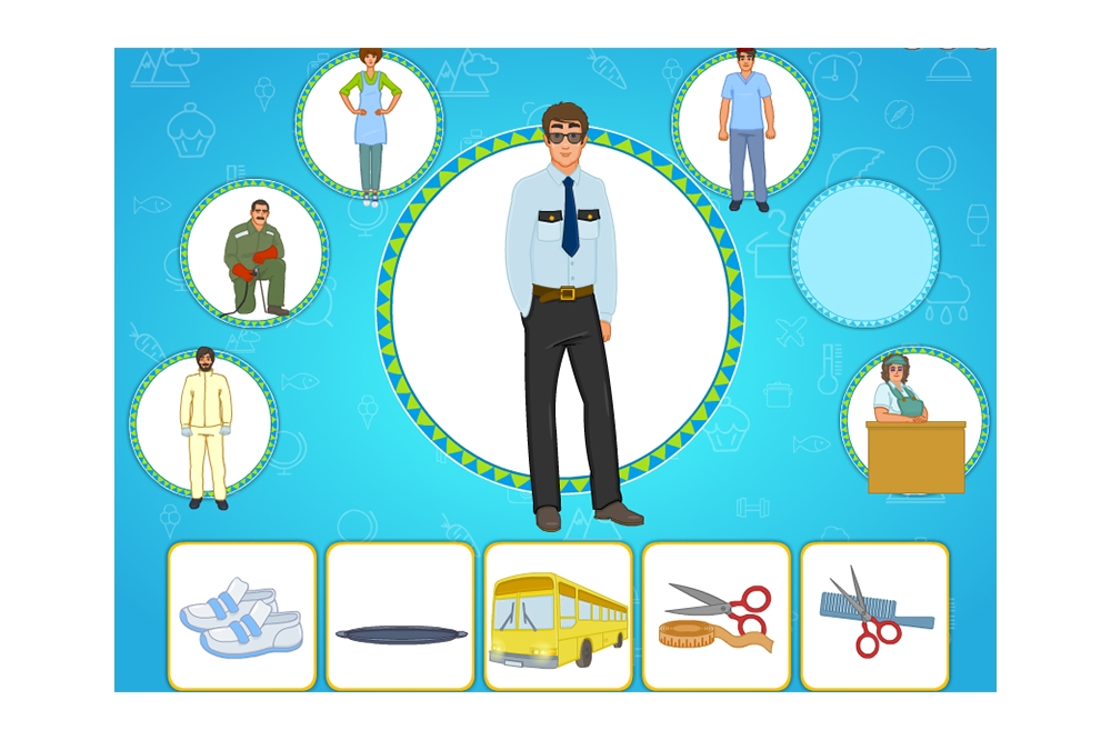 Угадай профессию - необходимо отгадать профессию человека по внешнему виду и голосовой подсказке. Определив персонажа, надо щелкнуть по нему мышью.