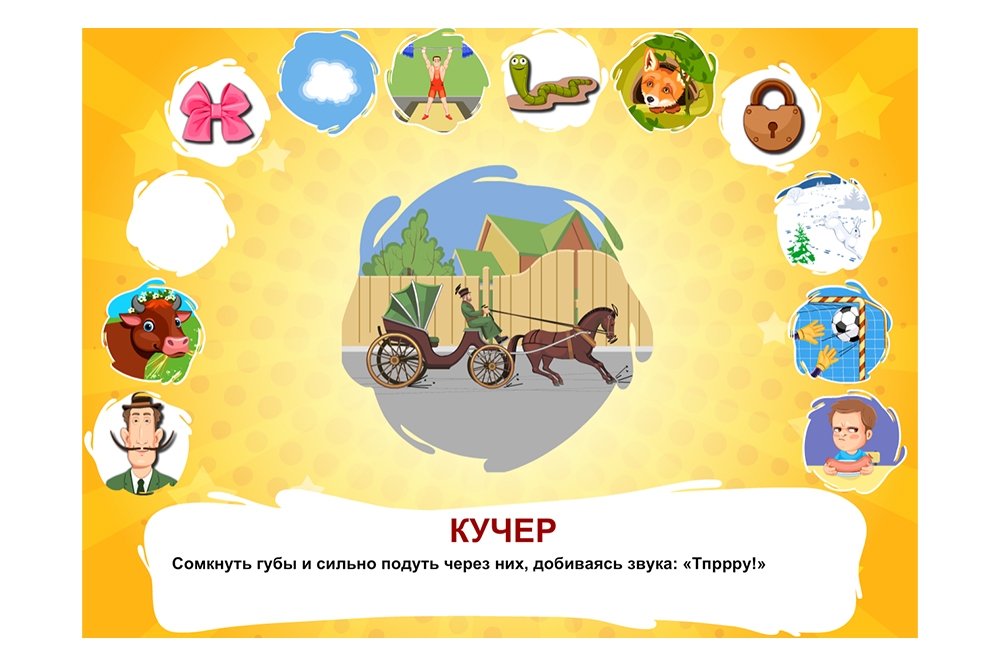 Артикуляционная гимнастика - ребенок смотрит на выбранную картинку и выполняет движение языком так, как описано в инструкции к упражнению.