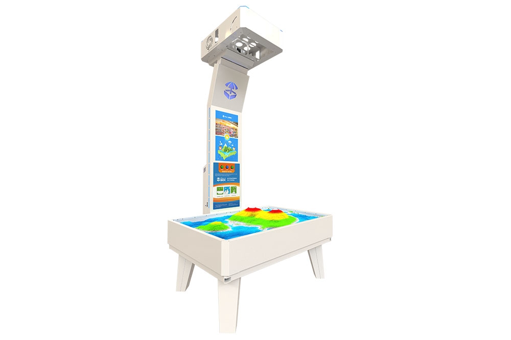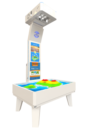 Работа интерактивной песочницы построена на технологии дополненной реальности. На песок проецируются настоящие текстуры водных объектов, гор, вулканов и многих других поверхностей. В итоге, песочница, дает возможность Вам своими руками создать собственный мир, который можно изменить мгновенно.