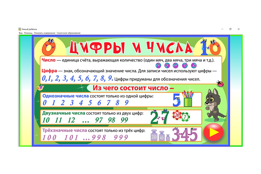 Сборник «Умный ребёнок» — это комплект интерактивных развивающих прог-рамм, включающих в себя обучающие и развивающие игровые задания, предназначенные для детей 2,5 - 5 лет. Программы разработаны с соблюдением санитарных требований при работе с компьютером и имеют интуитивно понятный для детей интерфейс, адаптированный для использования на устройствах с сенсорными экранами.
