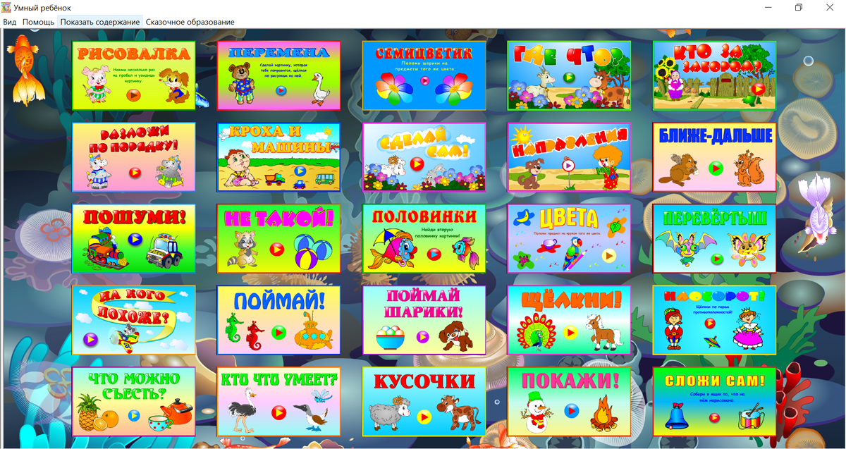 Рисовалка, Перемена, Семицветик, Где что?, Кто за забором?, Разложи по порядку!, Кроха и машины, Сложи сам!, Направления, Ближе - дальше, Наоборот!, Пошуми!, Не такой!, Половинки,