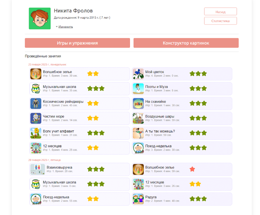 Профиль создается на каждого ребенка. В нём можно посмотреть историю занятий: когда ребенок занимался, какие игры проходил, сколько по времени, как он справился. Отметку по каждой игре или упражнению ставит педагог. Они нужны для специалиста, чтобы оценить проведенную с ребенком работу и корректировать план занятий: повторить пройденный материал, вернуться на прошлый этап, перейти к следующей теме.