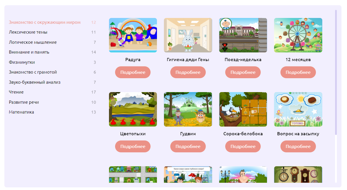 - Знакомство с окружающим миром (Радуга, Гигиена дяди Гены, Поезд-неделька, 12 месяцев, Цветопыхи, Гудвин, Сорока-белобока, Вопрос на засыпку).