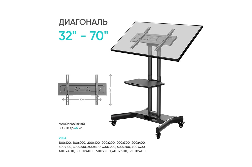 VESA | 100x100, 100x200, 200x100, 200x200, 200x300, 200x400, 300x100, 300x200, 300x300, 300x400, 400x200, 400x300, 400x400, 500x400, 600x200, 600x300, 600x400 мм |