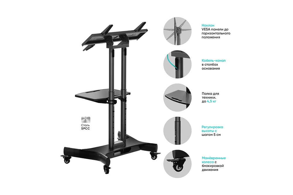 Материал: основание, колонны, VESA-панель – холоднокатаная SPCC сталь, полка – пластик